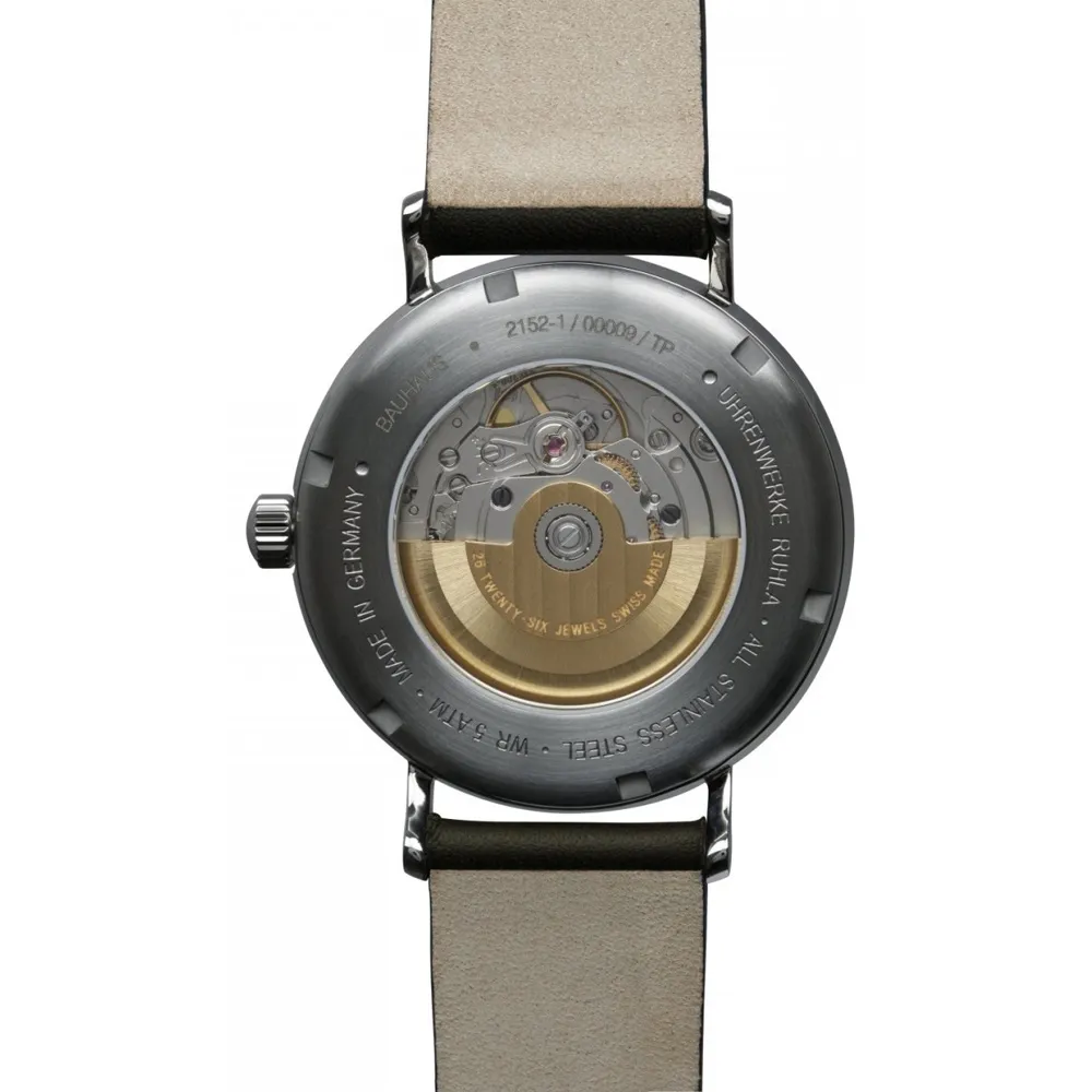 - Herrenuhr mit handgefertigtem dunkelgrünes Kalbslederband mit geprägtem Bauhaus Schriftzug und Dornschließe