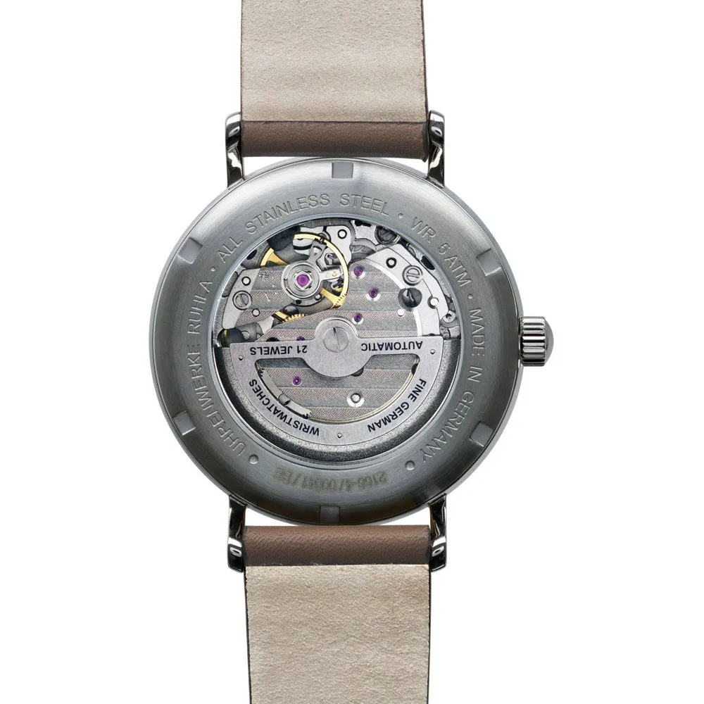 - Herrenuhr mit handgefertigtem braunem Kalbslederband mit geprägtem Bauhaus Schriftzug und Dornschließe