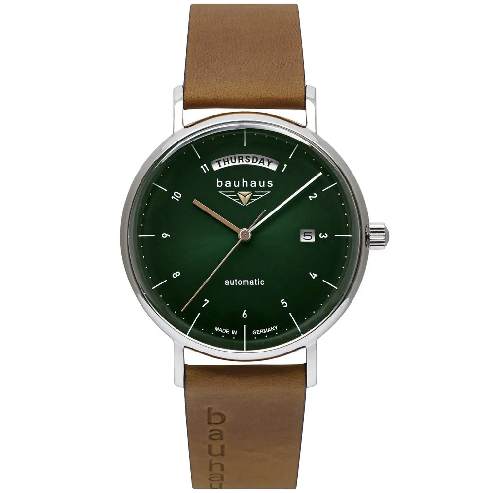 Bauhaus Automatikuhr grün silberfarben mit braunem Lederband 2162-4