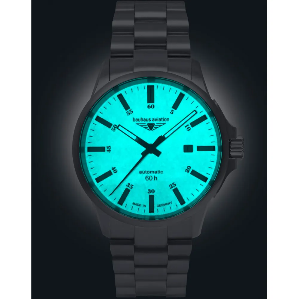 - beiges, nachts leuchtendes Zifferblatt mit silberfarbenen Leuchtzeigern und Indizes