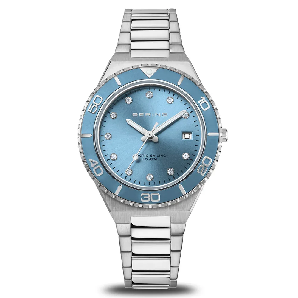 BERING Damenuhr Classic Edelstahl mit blauem Zifferblatt und Zirkonia - Edelstahlgehäuse und blau beschichtete Lünette