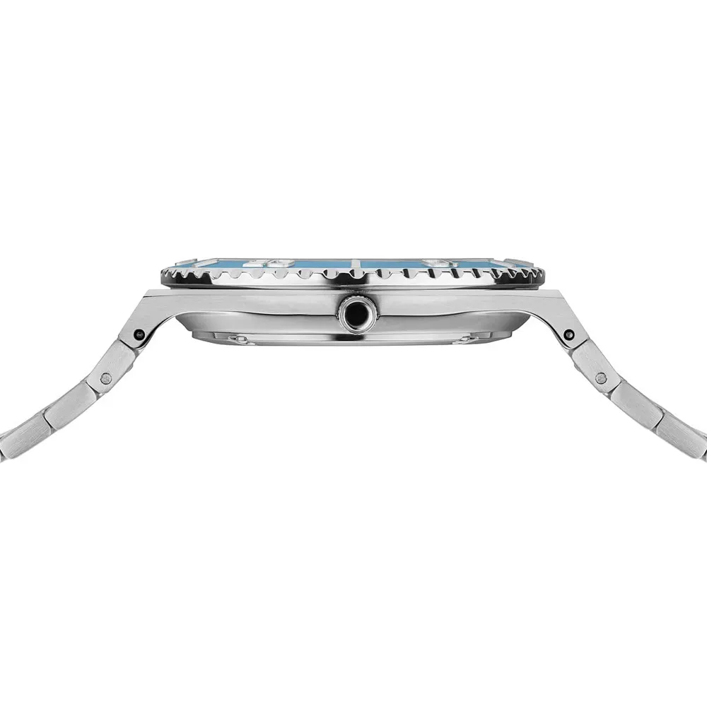 - Edelstahlgehäuse und blau beschichtete Lünette