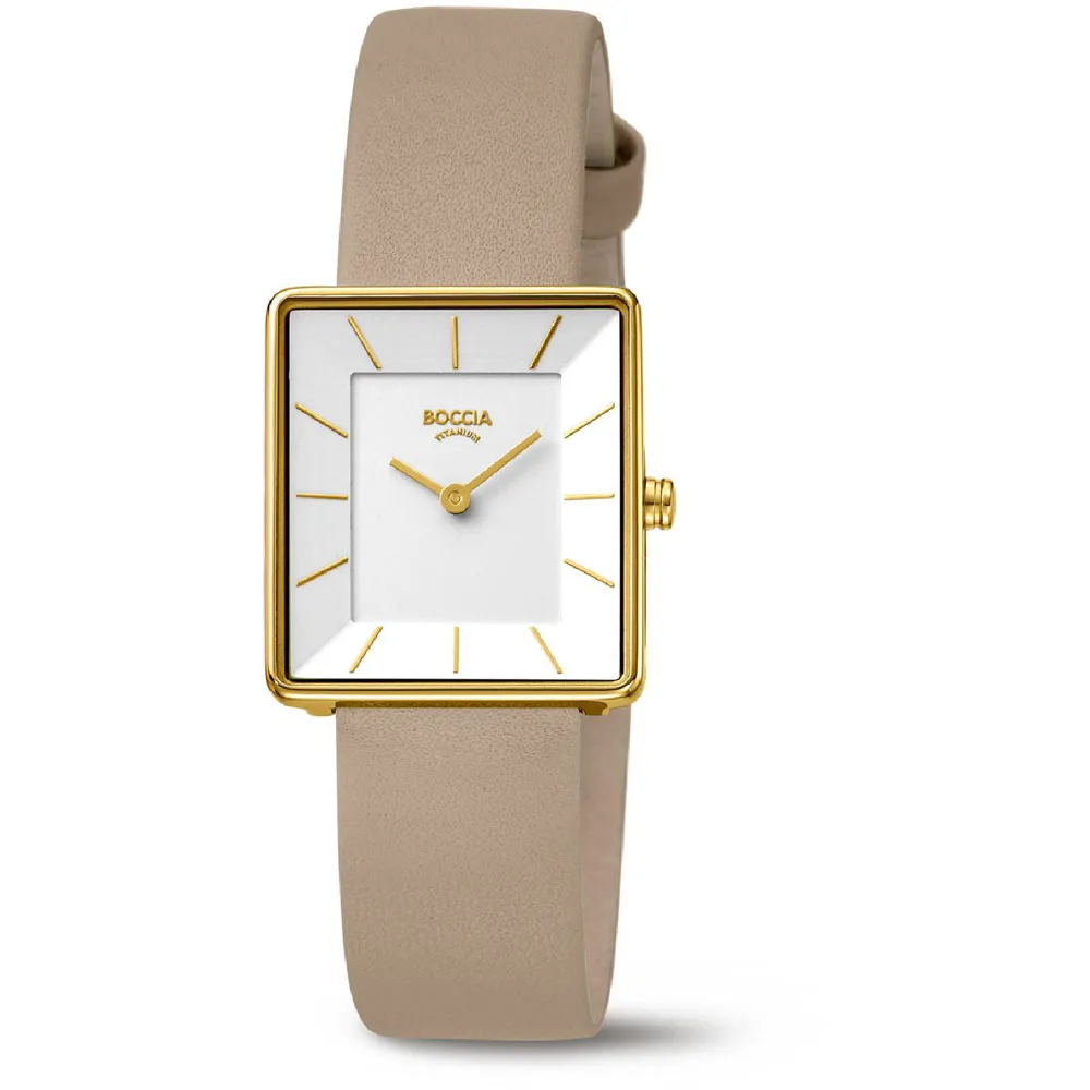 Boccia Damenuhr Titan goldfarben eckig mit braunem Lederband 3351-04