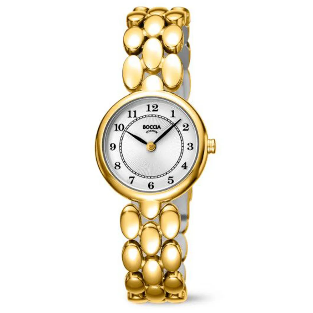 Boccia Damenuhr Titan goldfarben ist elegant und wirkt zudem sehr edel. Das Gehäuse aus Titan ist leicht und langlebig. Diese Uhr ist der perfekte Begleiter für jede Gelegenheit und schmückt das Handgelenk ihrer Trägerin.