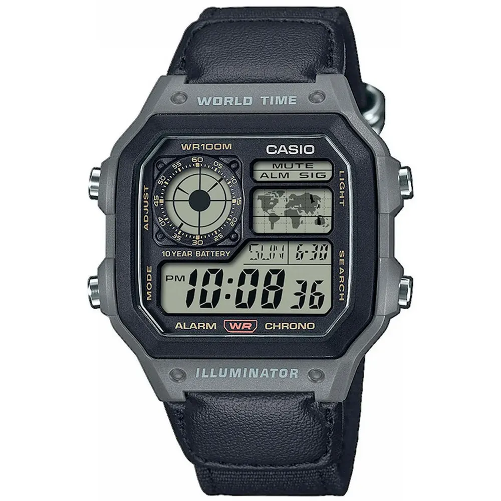Casio Digitaluhr schwarz grau mit LED Beleuchtung und Textilband AE-1200WHUB-8AVEF