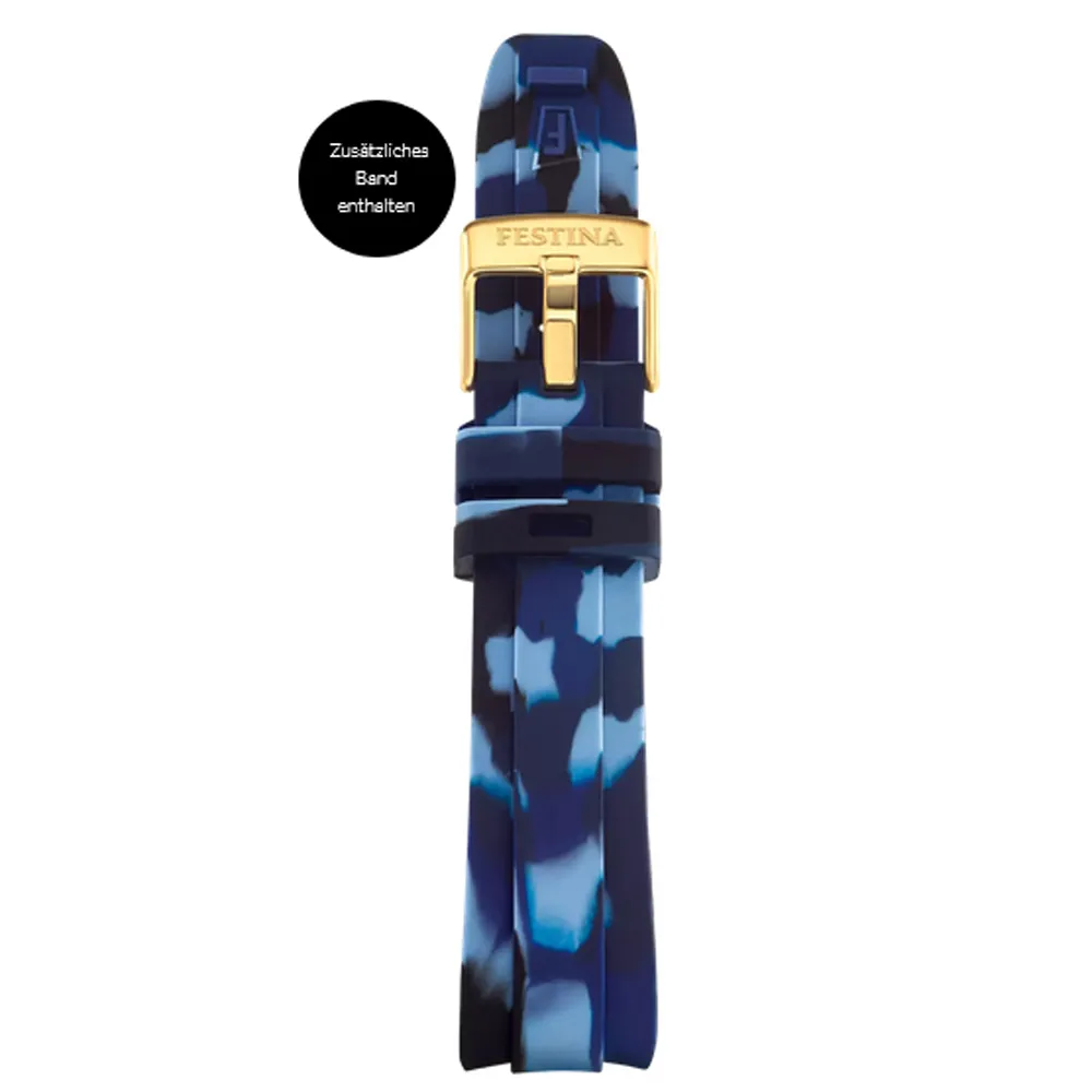 - im Lieferumfang ist ein zusätzliches Festina Camouflage blaues Silikonband mit goldfarbener Dornschließe