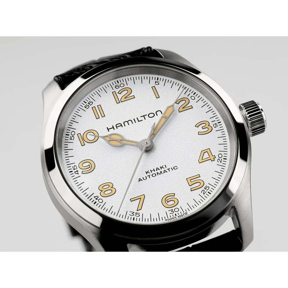 HAMILTON Herrenuhr Automatik Khaki Field Murph silberfarben weiss mit Lederband H70405710