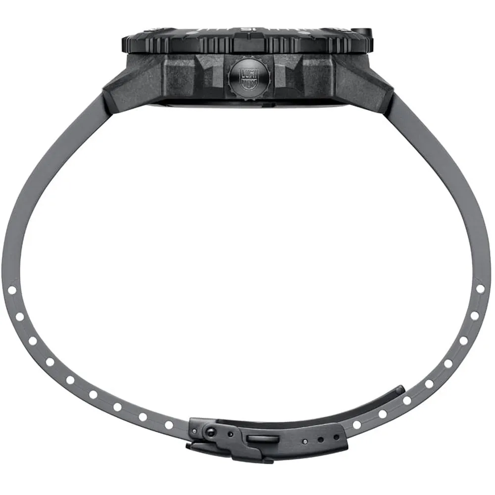 • graues geschmeidiges Kautschukarmband mit großem auffälligen Luminox Branding und schwarzer Faltschließe