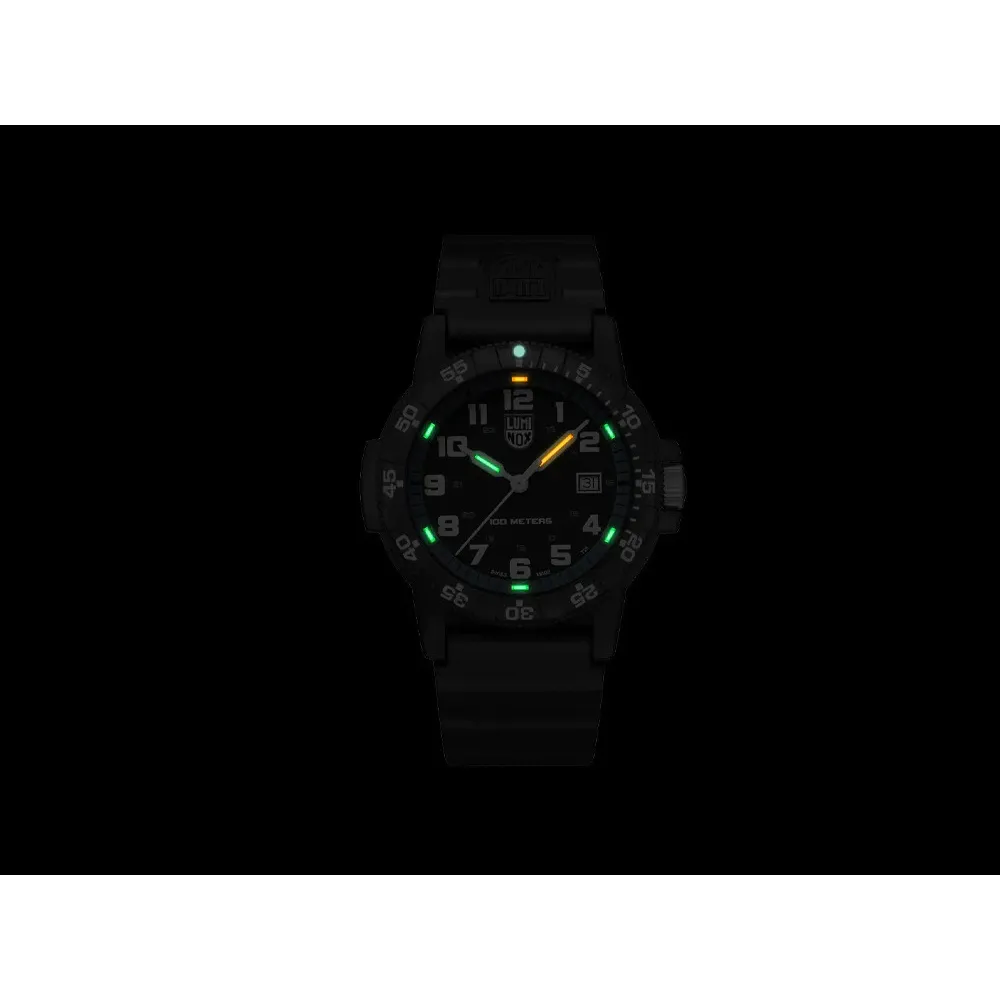 Die Uhr der Serie Sea Turtle im Black-Out-Design besticht durch 100 Meter Wasserdichtigkeit. Das Schwarz in Schwarz gehaltene Zifferblatt ist ausgestattet mit dem bewährten Luminox-Light-Technology-Beleuchtungssystem.