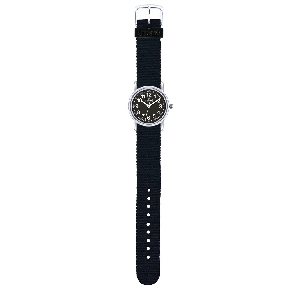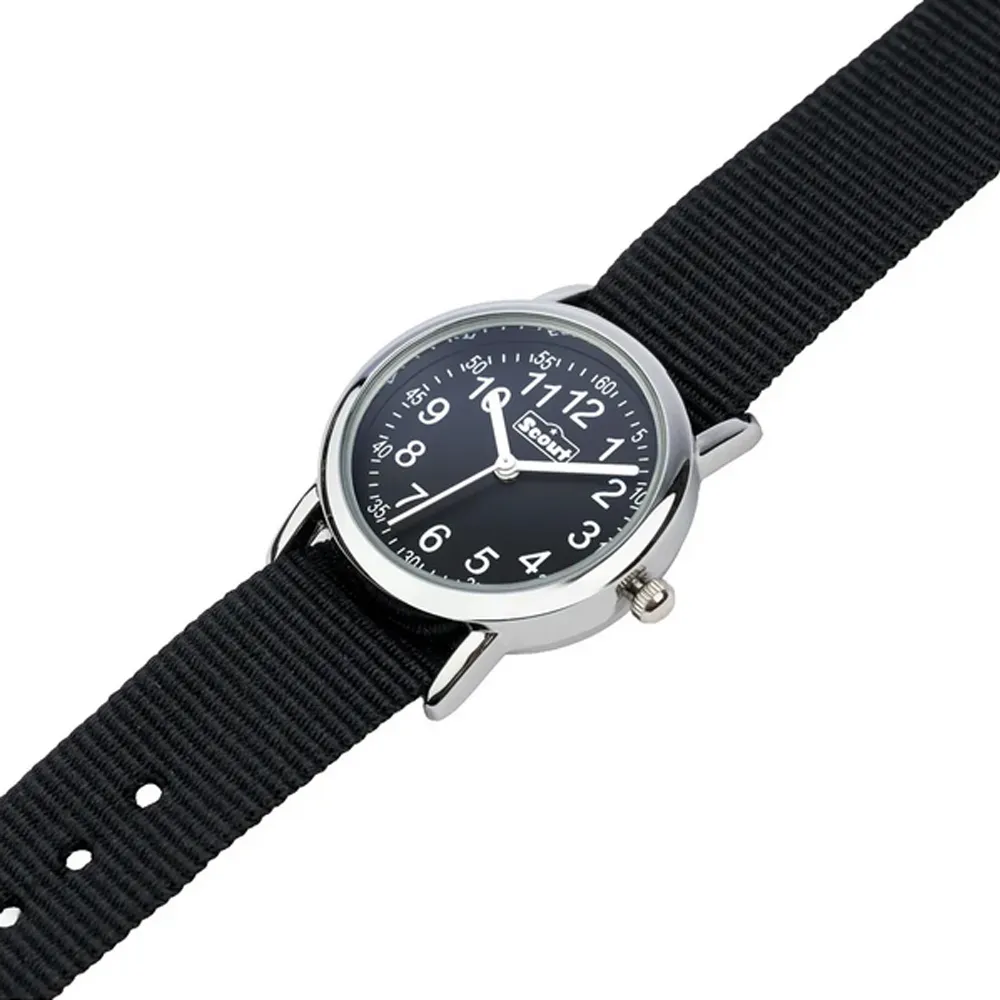 • mit gewebtem schwarzem Stoffband welches an einem Stück ist und unter der Uhr durchgezogen wird