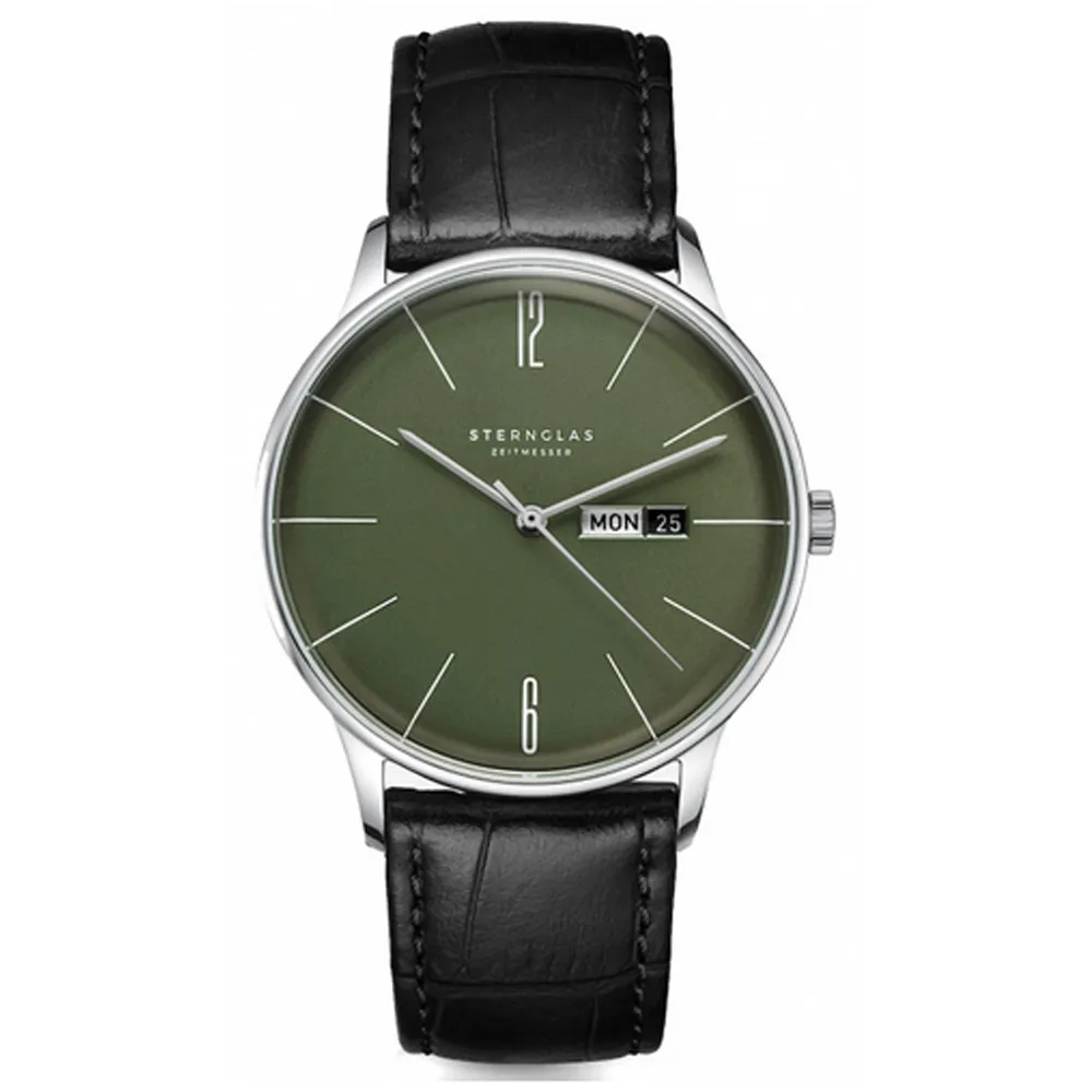STERNGLAS Armbanduhr Berlin olivgrün mit Lederband schwarz S01-BE08-HE04