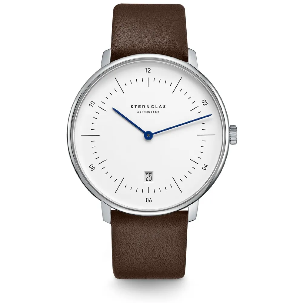 STERNGLAS Armbanduhr NAOS XL weiß silberfarben mit dunkelbraunem Lederband