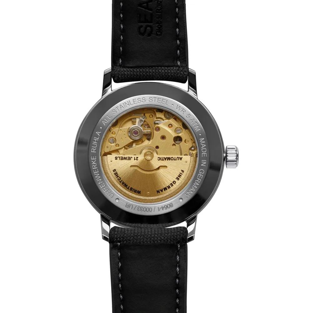 feines poliertes Edelstahlgehäuse mit Sichtboden japanisches Automatik Uhrwerk Citizen Miyota 8215, 21 SteineGangreserve ca. 40 StundenKrone mit Rändelung Mineralglas K1 SicherheitsglasDurchmesser 40 mm Gehäusehöhe 11 mm weisses EcoKeramik Zifferblatt mit silberfarbenen Zahlen und IndizesDatumsanzeige bei 3 Uhr schwarzes Textilband mit DornschließeBandbreite ca. 20 mmfür einen maximalen Armumfang von ca. 21 cm geeignetwasserdicht bis 5 barMade in Germany, eigene Produktion in RuhlaHerstellerangabenPoint Tec GmbH