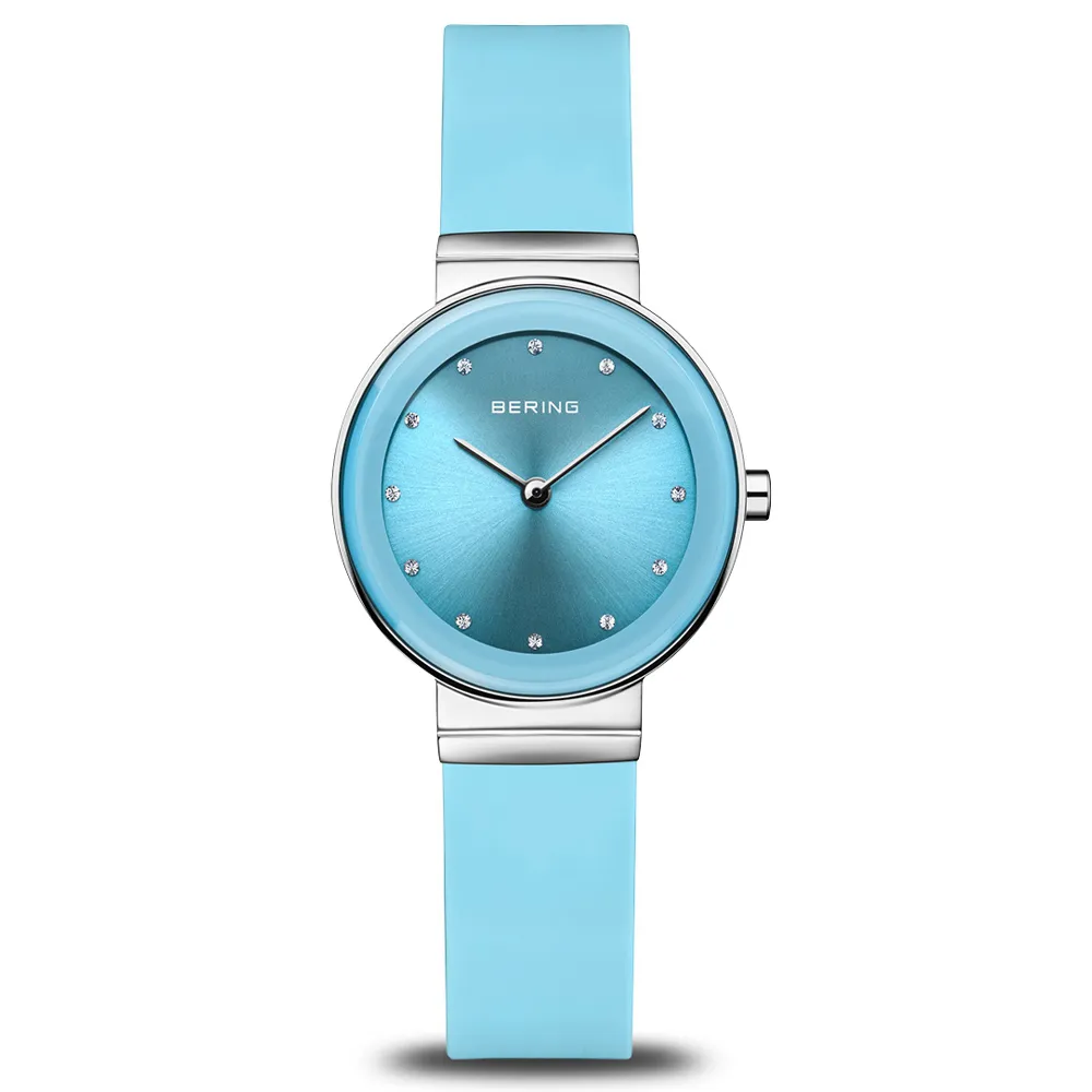 BERING Classic Damenuhr Edelstahl Zifferblatt blau Silikonband hellblau