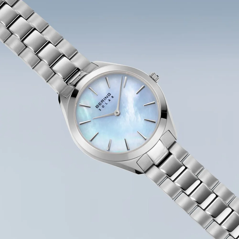 Bering Damenuhr Solar silberfarben mit Gliederband Zifferblatt Perlmutt