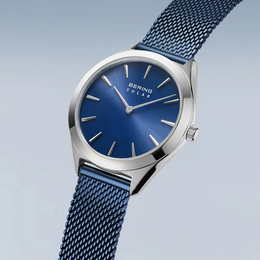BERING Damenuhr Solar silberfarben mit Milanaiseband blau 17331-307