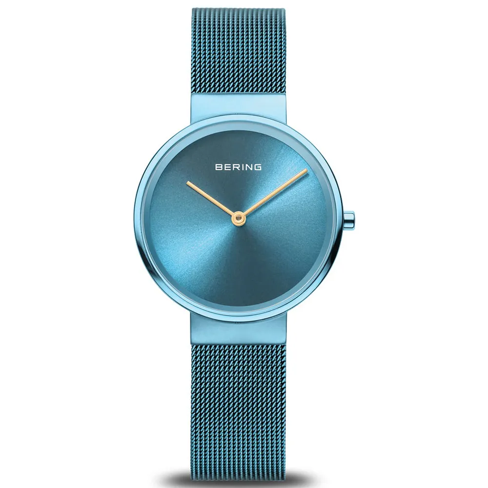 BERING Damenuhr blau glänzend mit goldfarbenen Zeiger 14531-388
