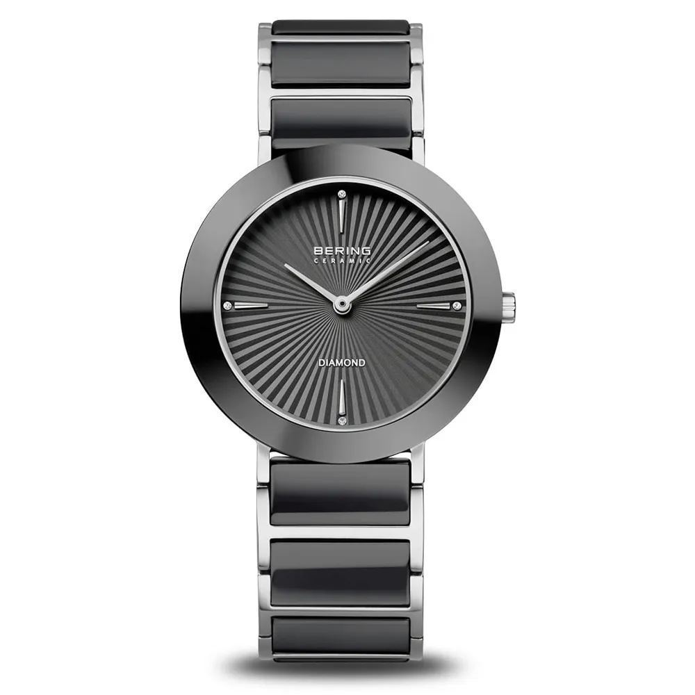 BERING Damenuhr schwarz silberfarben mit Keramik glänzt mit einem schönen Design und hochwertiger Keramik. Sieh hat ein zeitloses Erscheinungsbild und ist der perfekte Begleiter für jeden Anlass