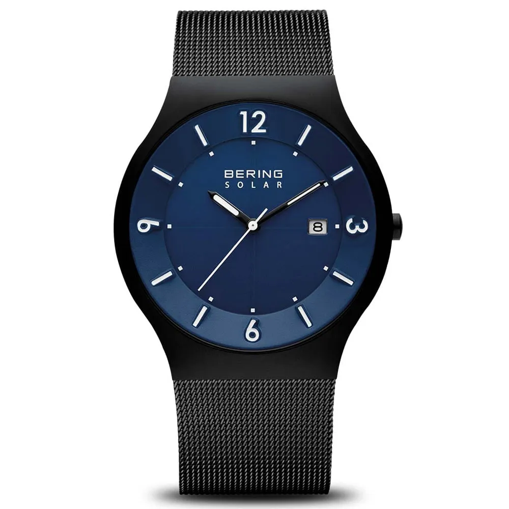 BERING Herrenuhr Solar schwarz mit Milanaiseband und blauen Zifferblatt 14440-227
