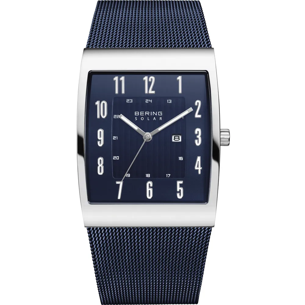 BERING Solar Herrenuhr eckig silberfarben mit blauem Milanaiseband 16433-307