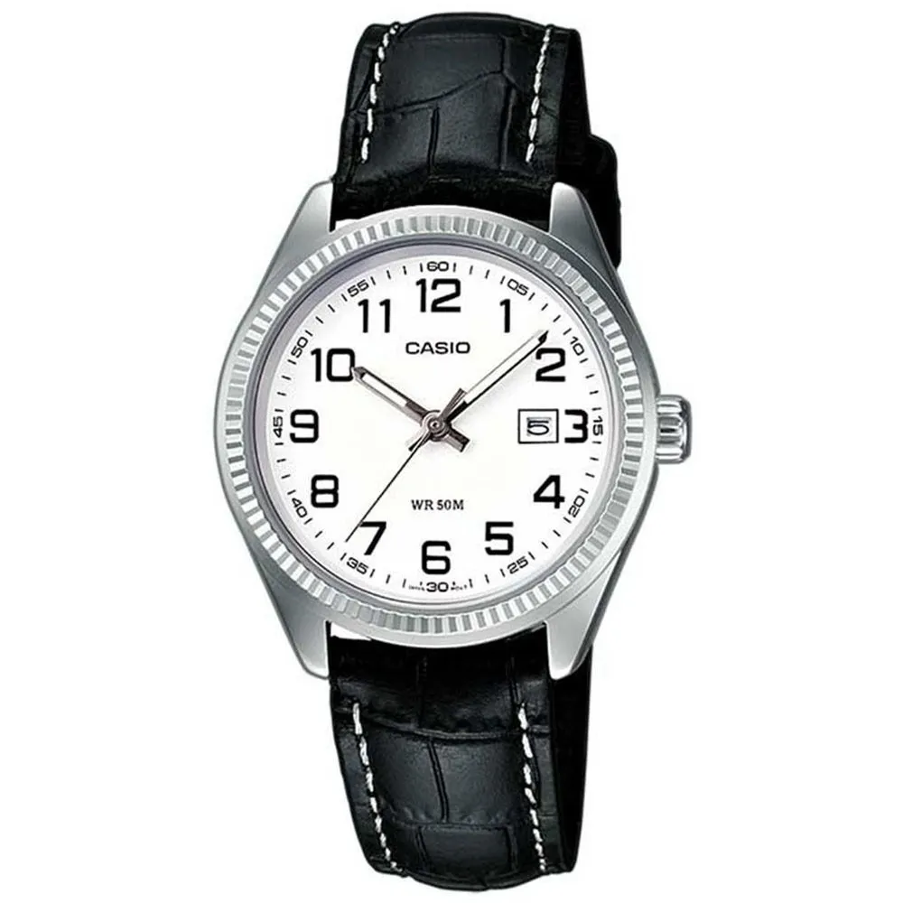 Casio Damenuhr rund silberfarben weiss mit schwarzem Lederband LTP-1302PL-7BVEG