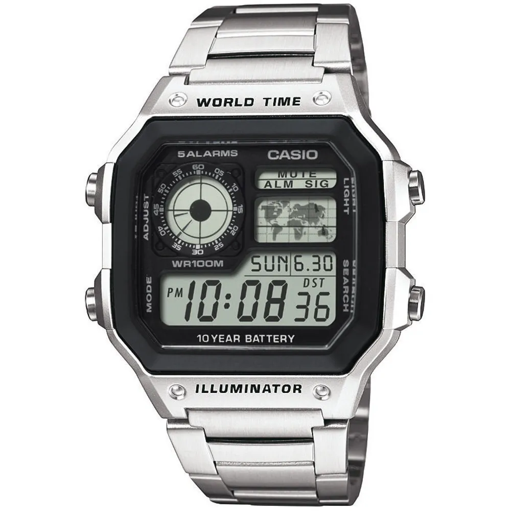Casio Digitaluhr mit LED Beleuchtung silberfarben und Edelstahlband AE-1200WHD-1AVEF