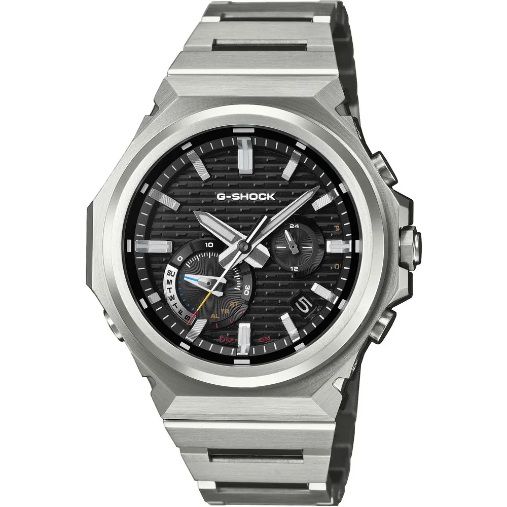 Casio G-Shock G-Steel Solaruhr GST-B1000D-1AER mit massiven Gehäuse und Edelstahlband akku betriebenes umweltfreundliches Quarzuhrwerk mit Warnung bei schwacher Ladekapazität stoßsicher durch innovative Carbon Core Guard Gehäusedämpfung Breite des Uhrgehäuses im Durchmesser ca. 44 mm Gehäusedicke ca. 11,5 mm Gewicht der Uhr cirka 120 Gramm Edelstahlgehäuse silberfarben mit schwarzen und roten Karbon Kunststoff Komponenten strukturiertes Zifferblatt in schwarz mit silberfarbenen profilierten Strichindikatoren und einer Datumsanzeige bei 4.30Uhr 2 Totalisatoren dezentral auf dem Zifferblatt verbaut Uhrzeiger silberfarben mit im Dunkeln leuchtende Neobrite Beschichtung hochwertig verarbeitetes silberfarben poliertes und teils matt geschliffenes Edelstahluhrband Uhrband mit Faltverschluss und Sicherheitsdrücker für einen Armumfang ab ca. 15 cm bis max. 20,5 cm geeignet - Erweiterungsglieder gern auf Anfrage erhältlich mit weisser Led Beleuchtung durch Knopfdruck mit Bluetooth Funktion zum kabellosen Verbinden mit Ihrem Smartphone - Uhrzeit wird dadurch automatisch präzise synchronisiert mit Stoppfunktion, Timer, Tagesalarm und vielen weiteren Funktionen das glasklare Mineralglas schützt die Uhr weitgehend vor unschönen Kratzern wasserdicht bis 20 Atm Lieferung in dazugehöriger Casio G-Shock UhrboxHerstellerangabenCasio Europe GmbH