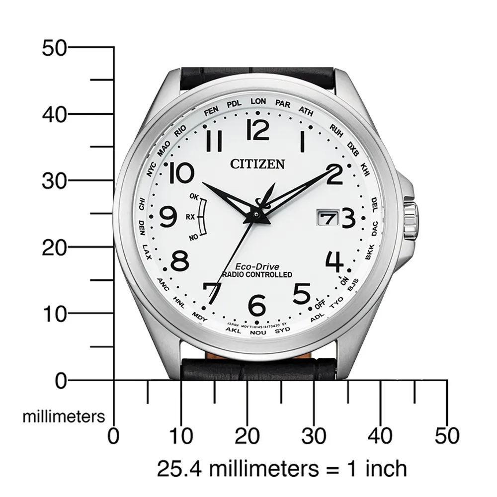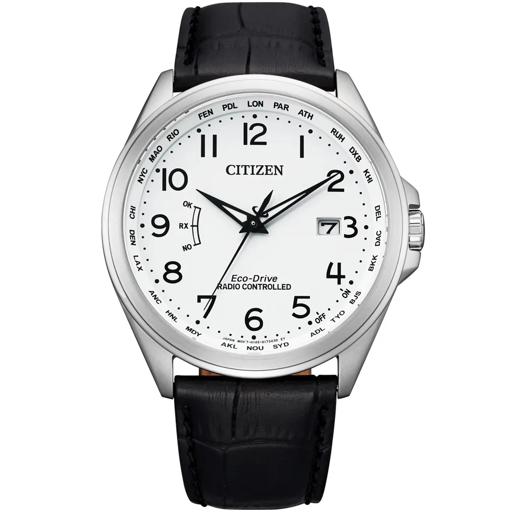 Citizen Herrenuhr Funk Solar silberfarben mit schwarzem Lederband CB0250-17A