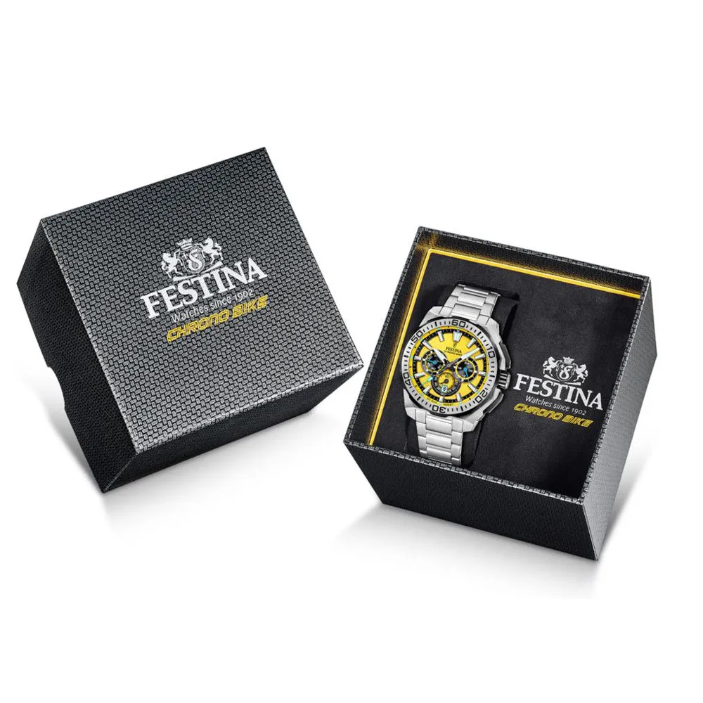 Festina Chrono Bike Herrenuhr Chronograph Edelstahlband Zifferblatt gelb