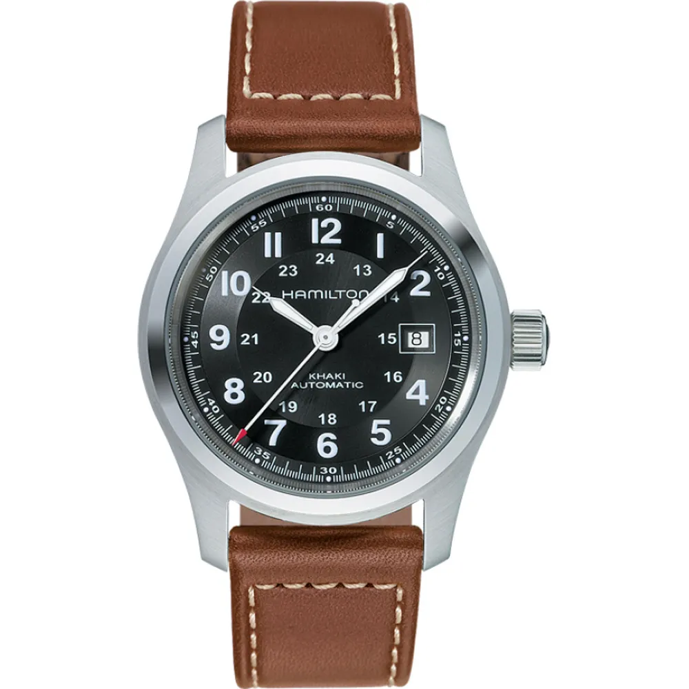 HAMILTON Herrenuhr Edelstahl mit braunem Lederband Khaki Field Automatik