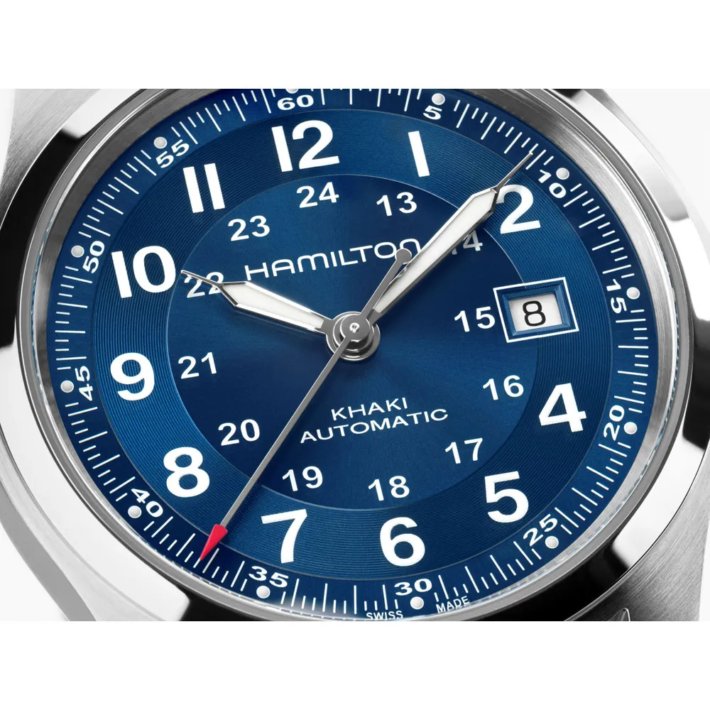 HAMILTON Herrenuhr Khaki Field Automatik blau Lederband braun 42 mm H70605540