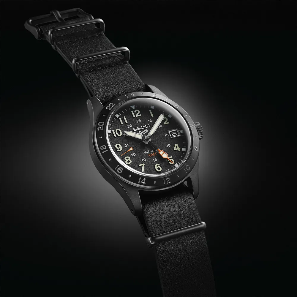 Seiko 5 Sports GMT Automatikuhr black ip mit schwarzen Lederband SSK025K1