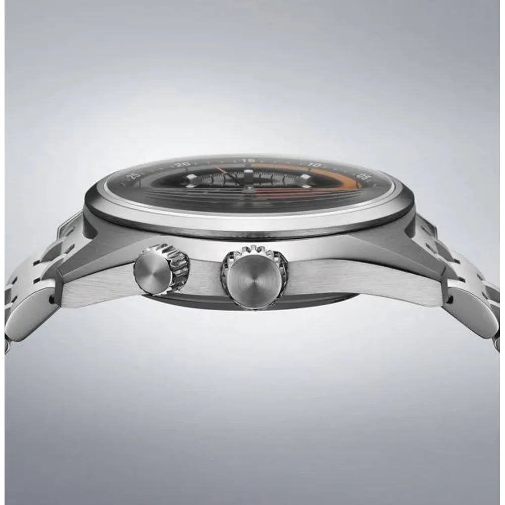 - mattweisses Zifferblatt mit schwarzer Rehaut und orangen Details